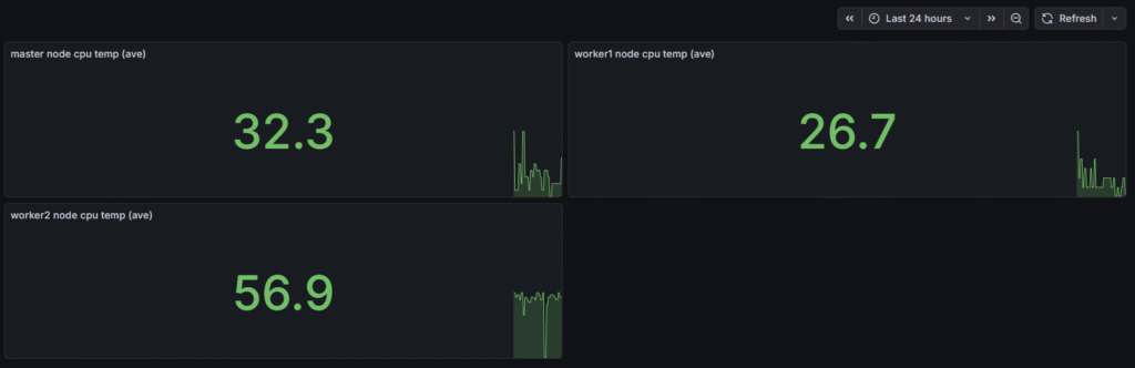 chart: ./charts/grafana-dashboardsそして、払い出すと、以下のように各NodeのCPUの温度がダッシュボードで表示できました。
