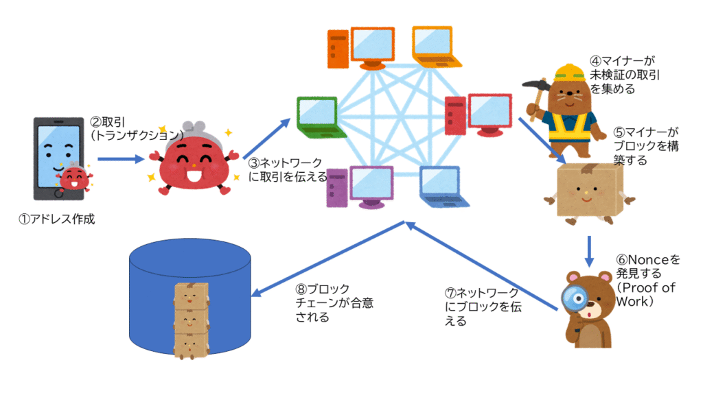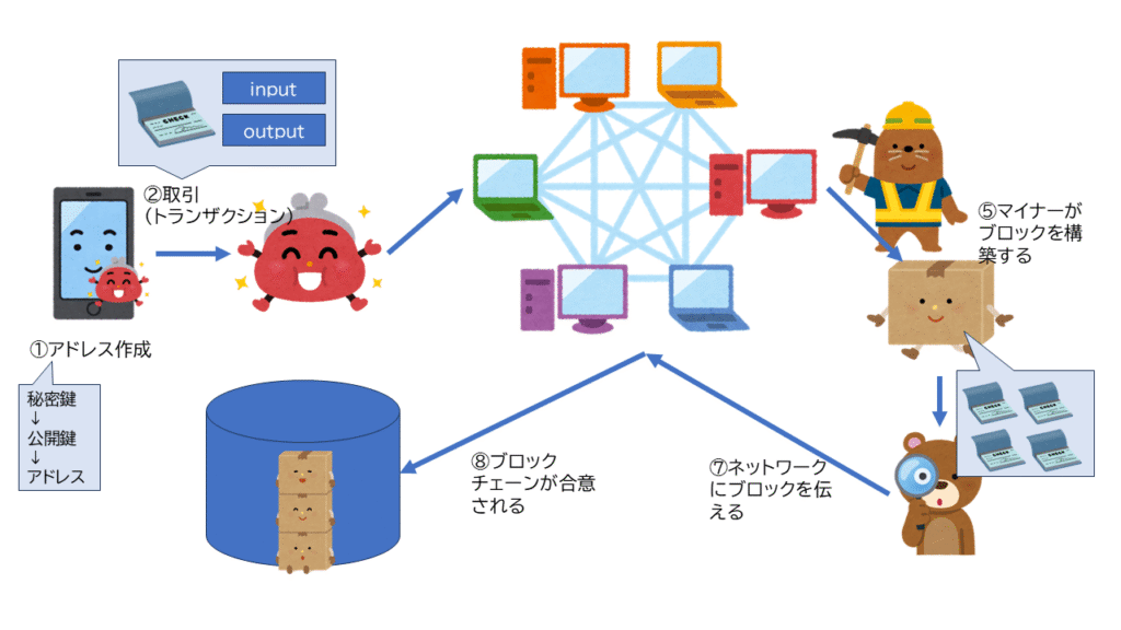 ブロックチェーンの全体像と、アドレスの作成まで実施してみました。