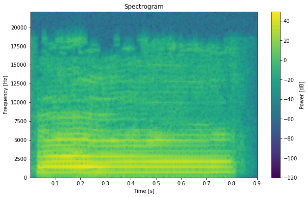 f, t, Sxx = spectrogram(data, fs=rate)グラフとして表示すると以下のようになります。