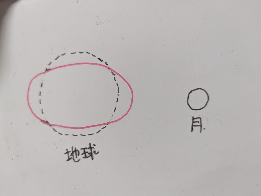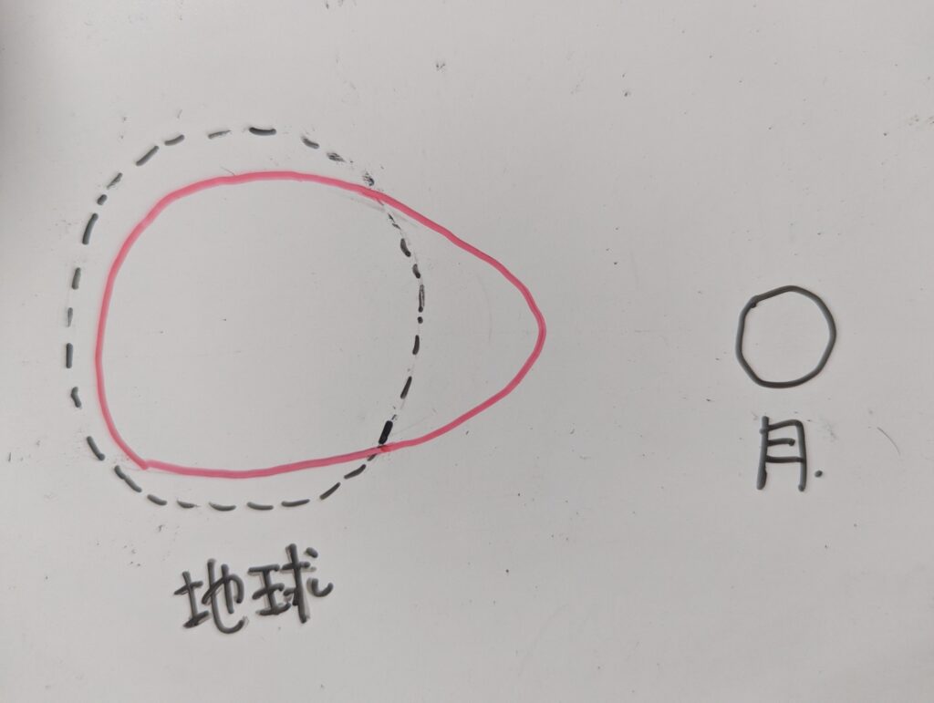 月に近い側では月の重力が慣性力よりも大きくなることで、潮汐力が大きくなりますし、一方で、月と反対側では慣性力が月の重力よりも大きくなるので、月とは反対向きの力が大きくなるという事です。