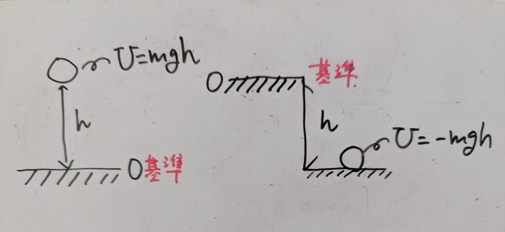 - 左の場合:基準を地面にしているため位置エネルギーは$mgh$($m$は質量、$g$は重力、$h$は高さ)