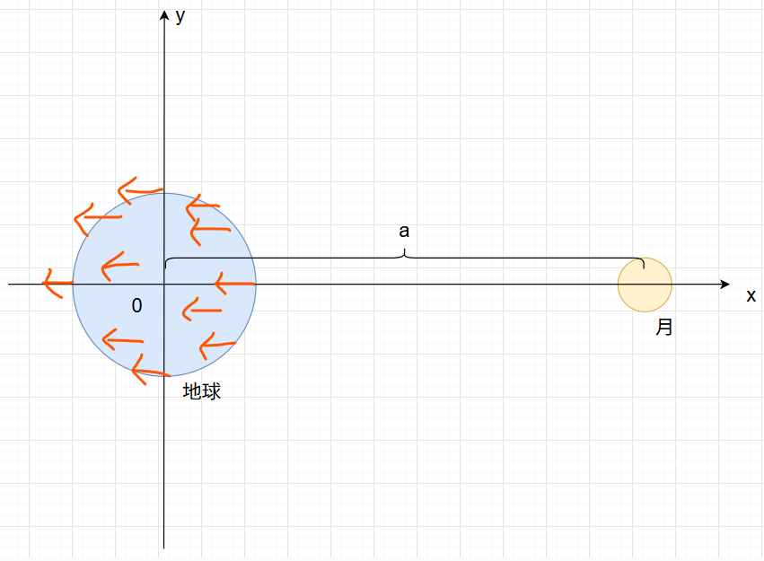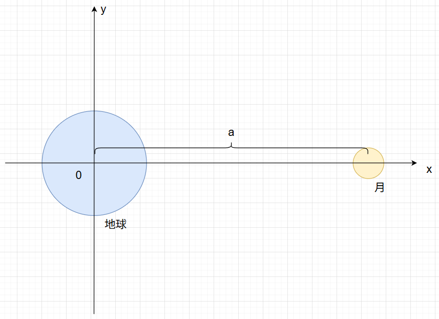 で表されます。(今回は図のように月に一番近い$(x, y, z) = (a, 0, 0)$の点で考えます)
