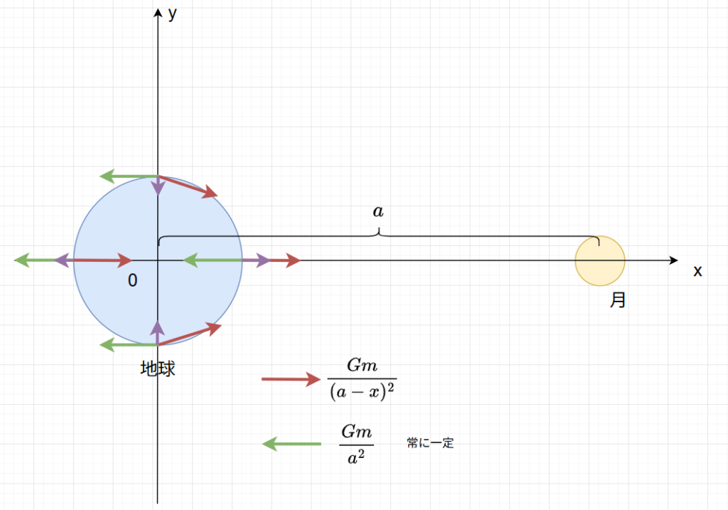 その結果、$ \frac{G m}{(a-x)^2} $は月に近い方は大きくなり、月に遠い方は小さくなります。