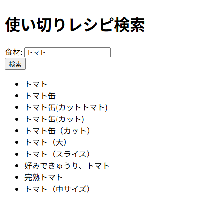 クエリとDB内のベクトルの類似度も求めるようにして、試しに「トマト」というクエリを検索してみると、バックエンドでDBに対して類似度の高いものを探します。